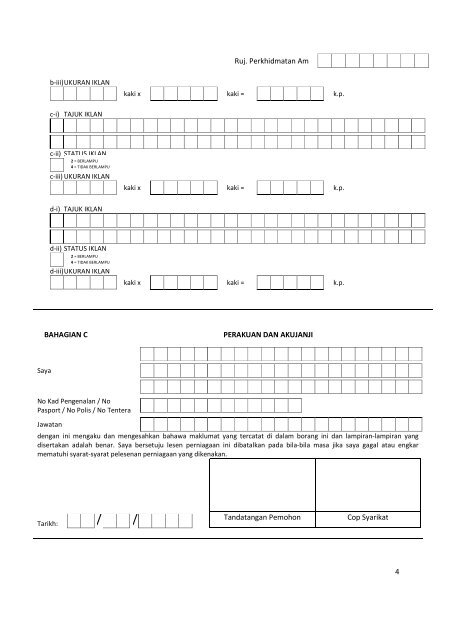Perlu diperbaharui setiap tahun. BORANG PERMOHONAN PENAMBAHAN PENUKARAN JENIS PERNIAGAAN ALAMAT PREMIS PAPAN IKLAN. Mengisi butiran Borang Permohonan Lesen Perniagaan dan Iklan seperti di Lampiran C dengan menggunakan HURUF BESAR sahaja.
