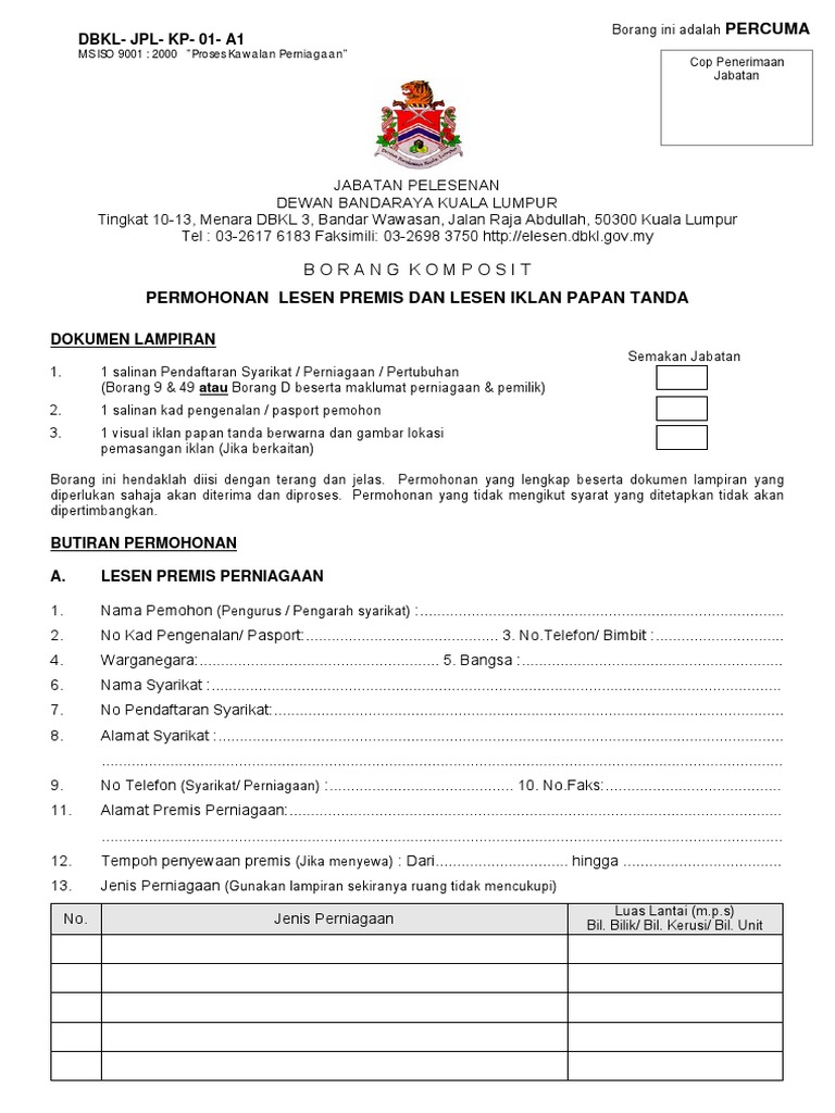 Borang Permohonan Lesen Di Bawah Undang-Undang Kecil Dewan Bandaraya Kota Kinabalu Borang Permohonan Lesen Komposit 3. Borang Permohonan Lesen Iklan Jadual Kedua Undang-Undang. Tingkat 5 Menara DBKL 2 Jalan Raja Laut.